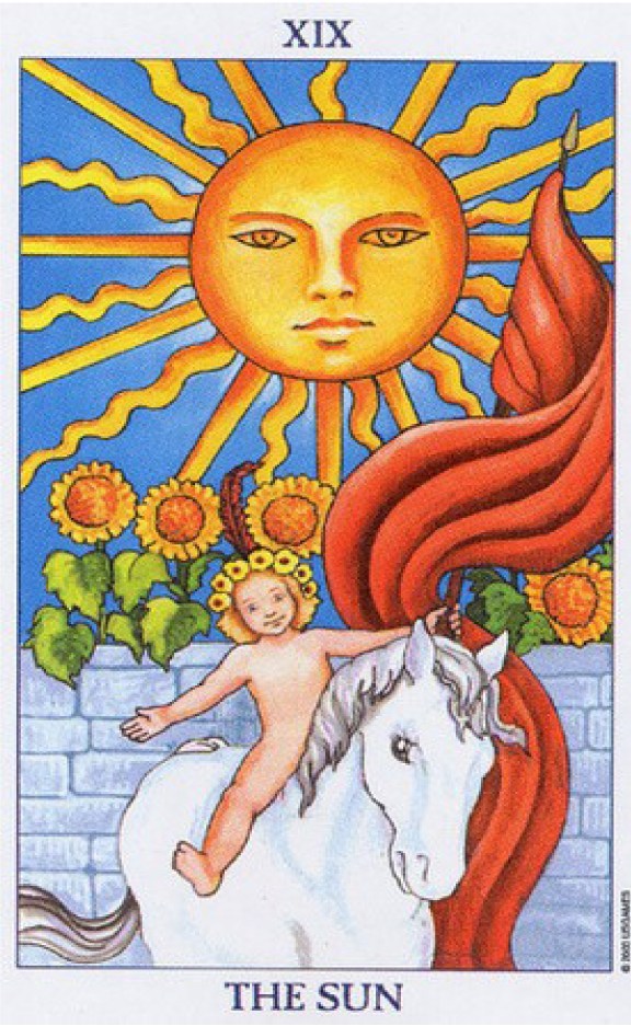 The Sun là hình ảnh của sự lạc quan và đủ đầy, là bình minh chói sáng sau đêm dài tăm tối. Vì là nguồn mạch của mọi sự sống trên trái Đất, nên the Sun cũng là nguồn sống của chính bản thân nó. Hình ảnh đứa trẻ nô đùa tượng trưng cho niềm hạnh phúc từ sâu trong tâm khảm khi chúng ta hiểu rõ được chính bản thân mình một cách chân thật nhất.