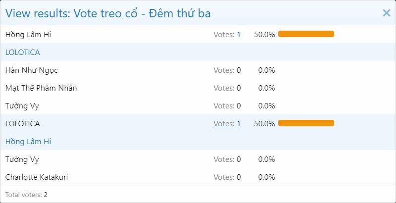 Uki, để huynh sửa lại tên của cái PollCần chứ bây giờ m.n sẽ vote ai là Sói, ai đã giết @Linh Phong và @Miêu Như