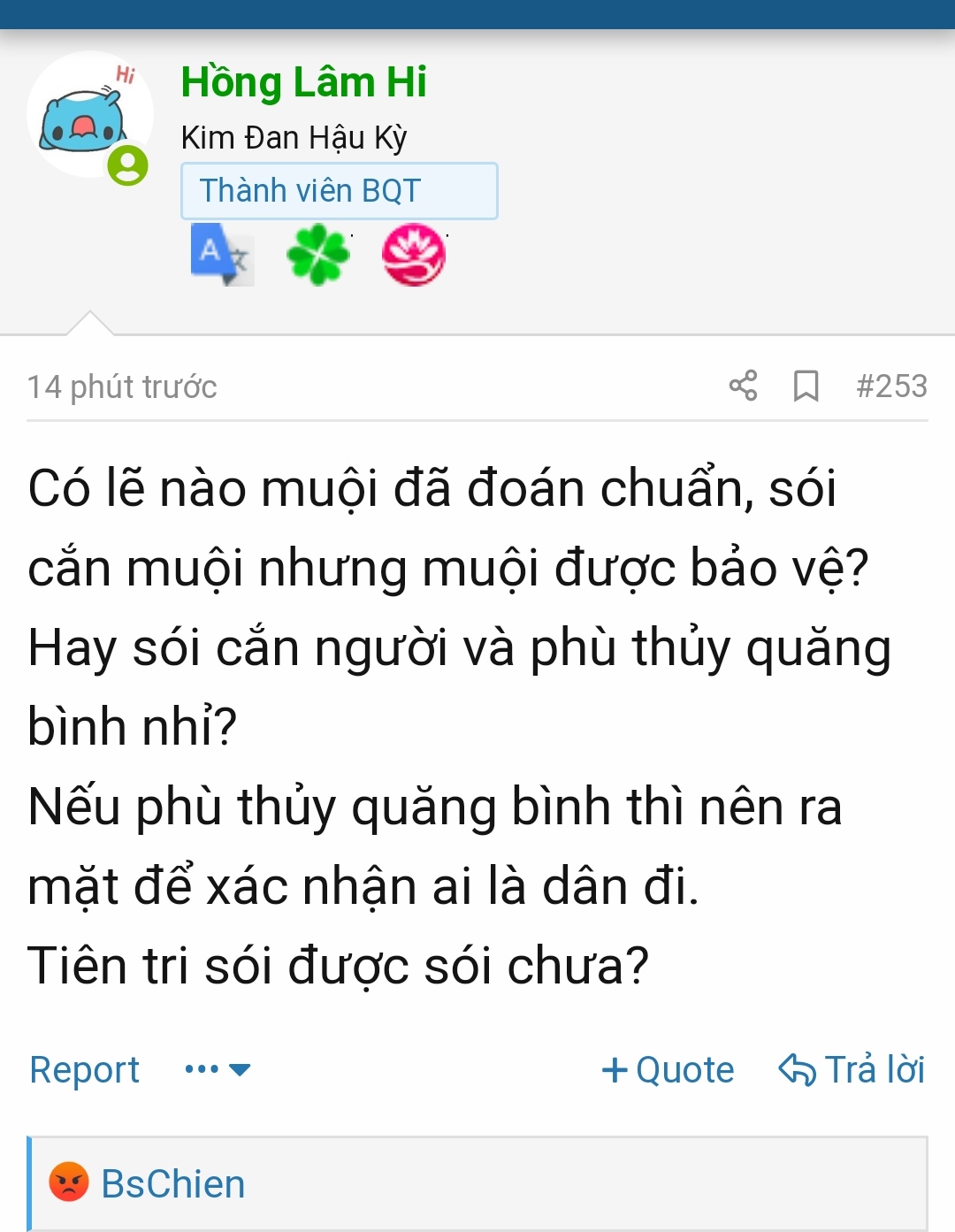 Sao huynh phẫn nộ với muội?Ta chỉ mới thử vote Miêu Ngư và nghi ngờ vô căn cứ Miêu muội, nhưng hôm qua ta lại bị cắn, nếu ko phải ta là phù thủy thì đã ngủm rồi. Đêm mai Miêu muội sẽ được ta tặng bình độc dù ta sống hay chết! Trần Mộ thì huynh nghi ngờ từ đầu, kết hợp với phản ứng của lão khi Hi muội chất vấn và dọa soi, nhưng sói lại cắn ta chứng tỏ ko dám ra tay với Hi muội vì sợ lộ cả nhóm.