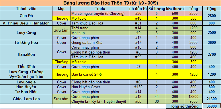 Dưới đây là bảng lương tháng 9 Đào Hoa Thôn, mọi người xem có thắc mắc hay cần chỉnh sửa gì thì báo lại cho Mon nha! Xincamon!
