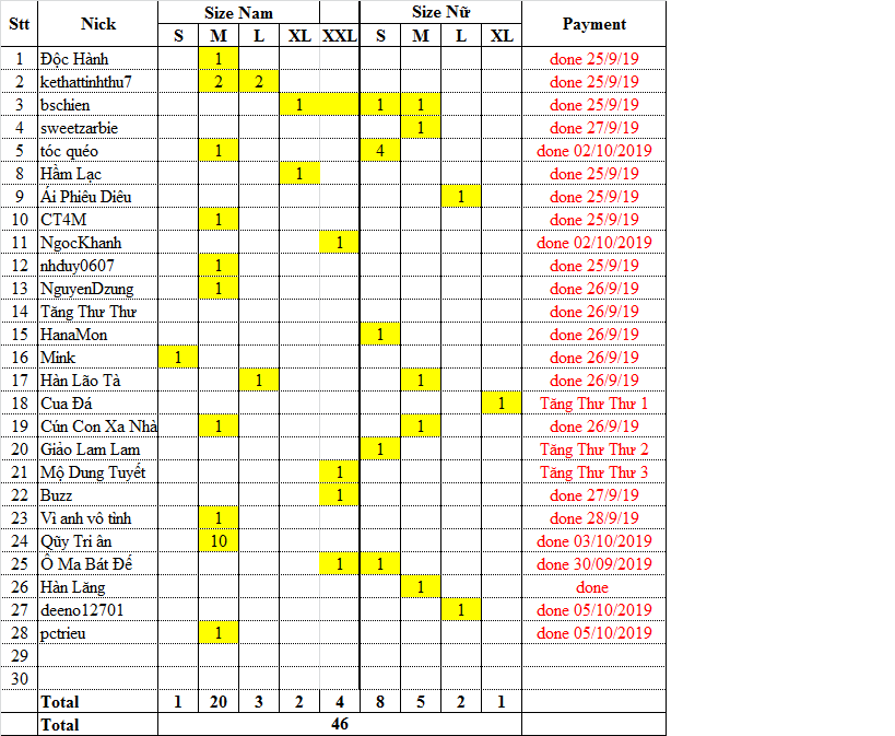 Đây là danh sách áo đã chuyển khoản cho em đến ngày hôm nay. Mọi người ghé ngang thì check giúp em nha ^^
