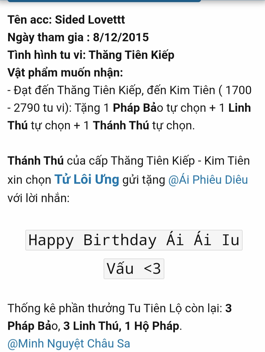 Chúc @Ái Phiêu Diêu muội sinh nhật vui vẻ, chúc muội luôn thực hiện được những điều muội muốn ❤.