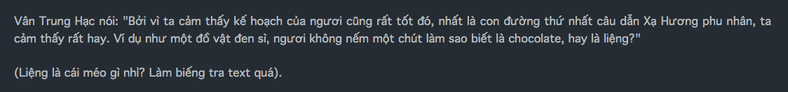 Ok quất luôn, nó nằm chương mấy ta vào sửa nà.Không biết nên mới phải nếm cho biết, biết rồi thì cần gì nếm, nói chung là nó thể hiện cái sự tục của thằng main, cái gì cũng dám làm.![]()