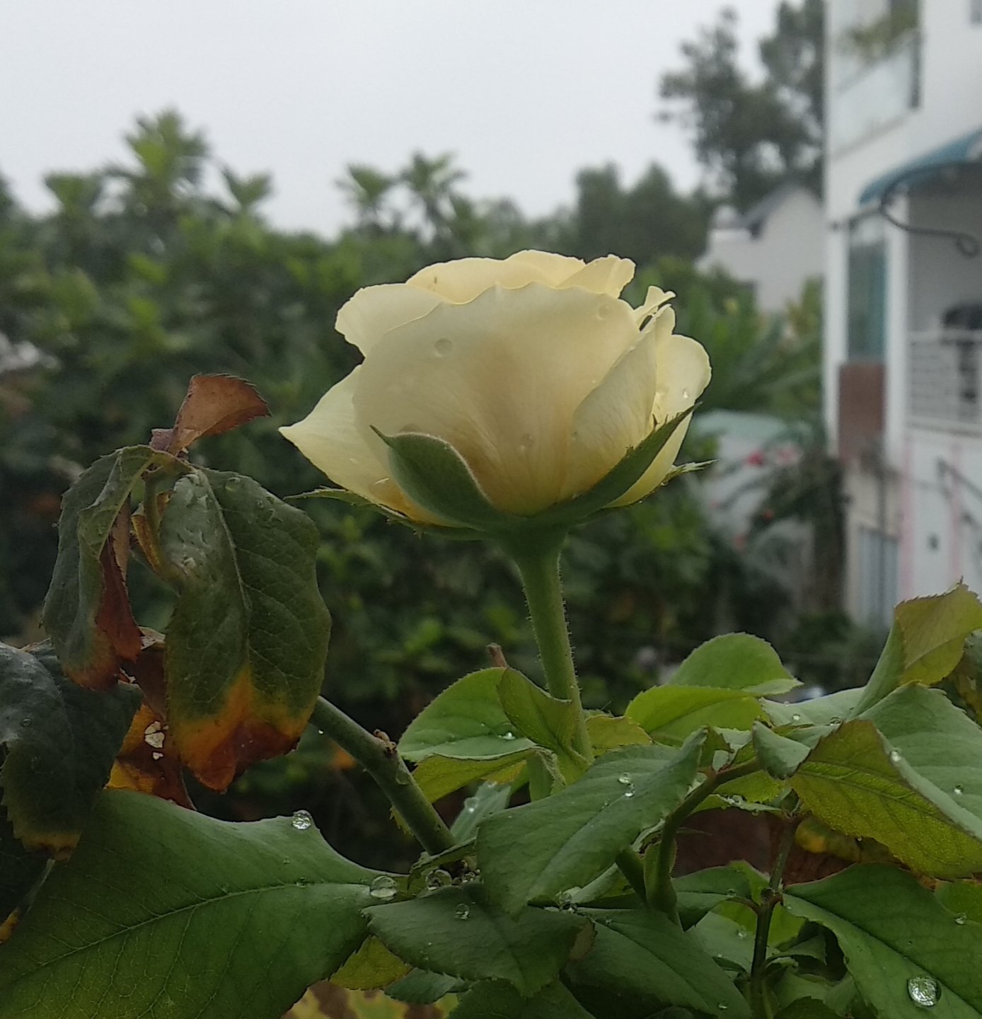 Đóa hồng này, mình cũng chẳng biết nó tên gì. Khi nở có màu trắng, khi tàn cũng sẽ màu trắng, nhưng khi nở rộ sẽ có phơn phớt màu mỡ gà như vầy. Loại hồng này không hương, cũng không quyến rũ, chỉ nở rộ kiêu hãnh, cánh dày đều đặn. Đặc biệt, mưa gió cũng không bị rơi cánh nào.