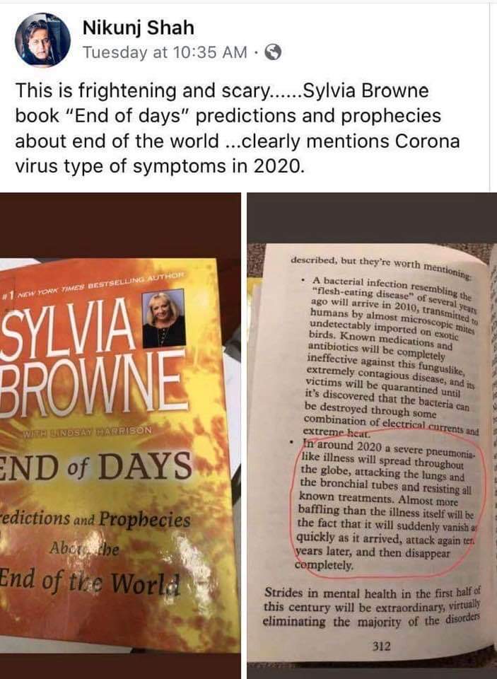 Điều này thật sự đáng sợ.... Cuốn sách (xuất bản năm 2008) mang tựa đề: Tiên đoán Tận Thế và tiên tri về ngày tàn Trái Đất của Sylvia Brown, nói rất rõ ràng về Virus Corona và những hệ chứng của nó trong năm 2020.
