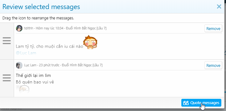 Muội có thể QUOTE liên tục các bài viết, rồi Insert Quote all nhéHuynh dẫn kiểu gì vậy