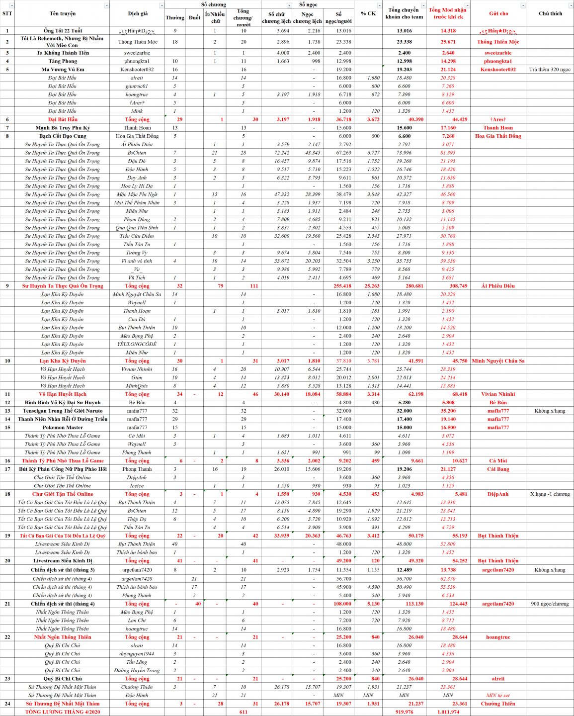 TỔNG KẾT LƯƠNG - THƯỞNG MẢNG DỊCH THÁNG 4/2020