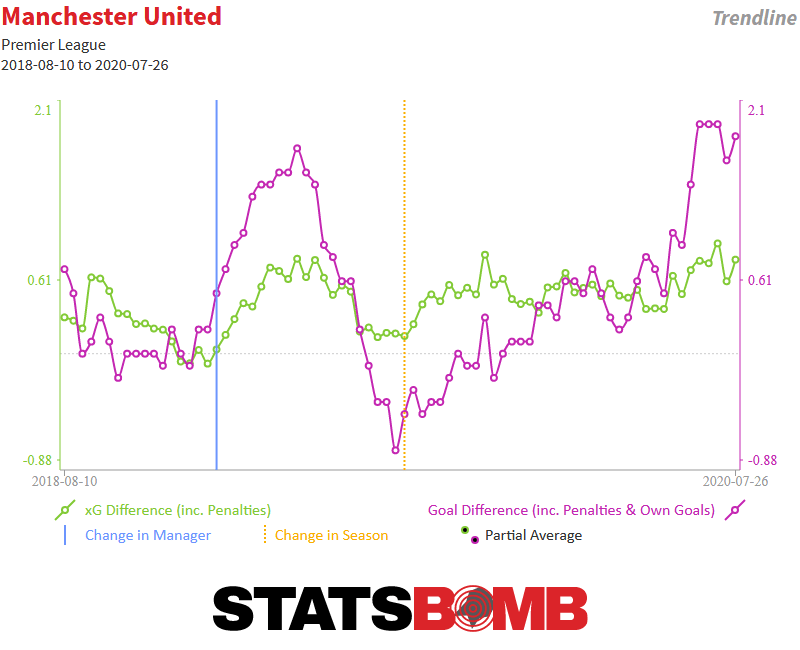 Nhưng nửa đầu mùa giải của Quỷ Đỏ là một hình ảnh không mấy sáng sủa, với sự đan xen đầy kỳ lạ của những kết quả tốt trước các đối thủ mạnh, và các kết quả tệ khi chạm trán những đối thủ được đánh giá yếu hơn. Phong độ ấn tượng sau đó trùng khớp với chuỗi 11 trận đầu tiên của nửa sau chiến dịch diễn ra một cách ổn định hơn, và một lịch thi đấu đầy lý tưởng sau đợt tạm hoãn mùa giải vì cô vít-19 là môi trường hoàn hảo cho sự trở lại của Pogba và để Greenwood trình diễn khả năng dứt điểm thậm chí còn vượt trội hơn cả sự nổi lên của Rashford 4 năm về trước.