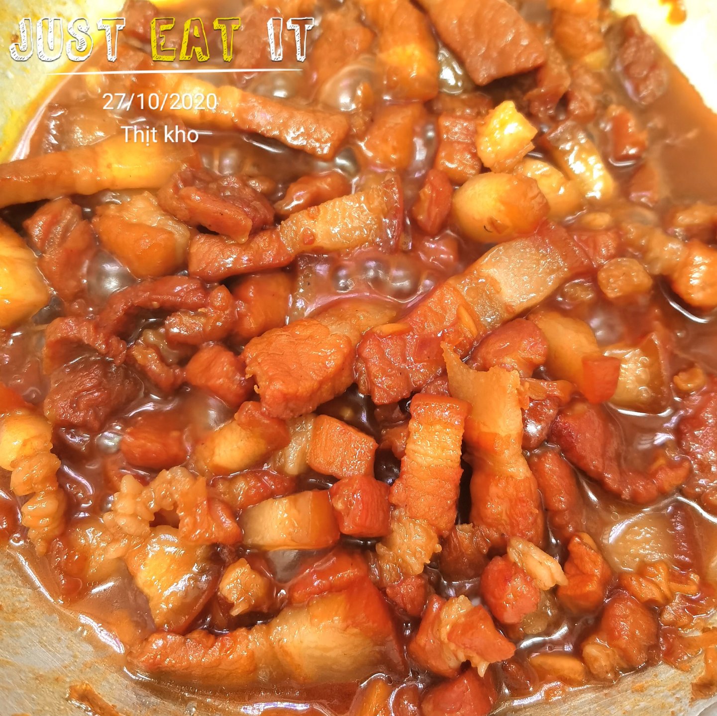 - Nấu liu riu chừng 15p là chảo thịt sệt nước lại rồi, cũng vừa đủ thời gian để mỡ ở thịt ba rọi chảy ra, đảo đều, tắt bếp và thưởng thức cùng cơm nóng hoặc nguội
