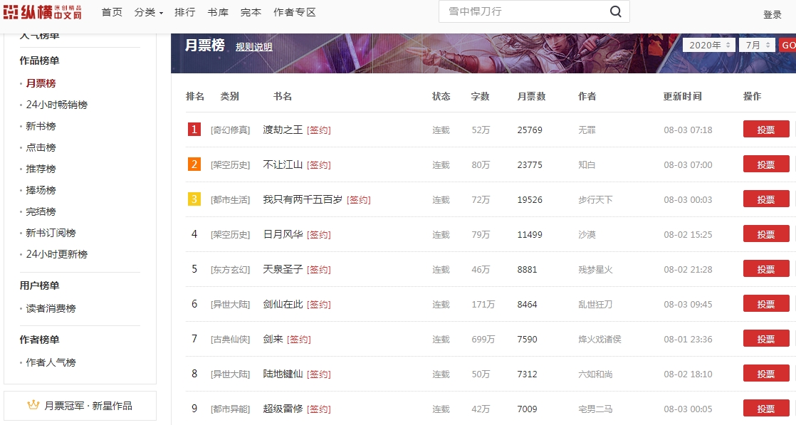 Tung Hoành top 10 nguyệt phiếu tháng 7: