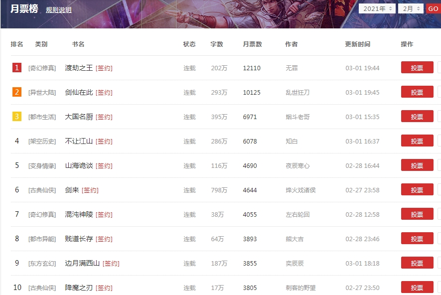 Top 10 nguyệt phiếu bảng Tung Hoành tháng 2-2021