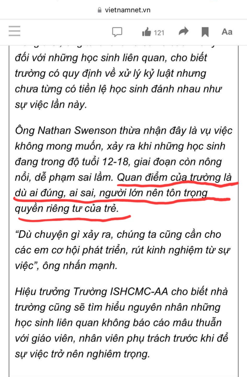 Cái đoạn gạch chân đệ hiểu là ông hiệu trưởng đang nói bà kia đăng hình ảnh với địa chỉ con bé lớp 8 lên mạng cho người ta sỉ vả là chẳng tốt đẹp gì, nhà trường muốn “chuyện nhỏ hoá không” là nghĩ cho bà này thì đúng hơn. Con mình đánh hội đồng bạn mà bị vả ngược, xong còn bịa chuyện để bênh con, làm lớn chuyện rồi lộ ra có mà bách nhục.Quan điểm của nhà trường khi trả lời báo Vietnamnet. Theo quan điểm này thì để tụi nó tự xử nhau à? Kiểu luật rừng chăng?
