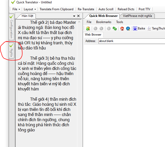 bạn chụp hình màn hình QT của bạn được không, chứ mình tìm đủ mọi cách mà ko làm cho cái ô Nghĩa biến mất được. Nó chỉ thu gọn vào 1 góc như thế này thôi.